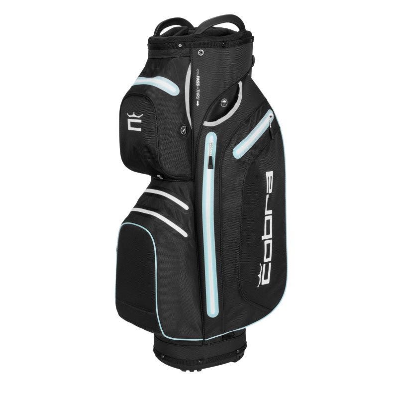 Upptäck Cobra Ultradry Pro Cart Bag – Black/Blue, den ultimata golfvagnbagen för alla väderförhållanden. Med en vikt på endast 2,5 kg och en 14-delad topp med en fullängdsavdelare för puttern,…: